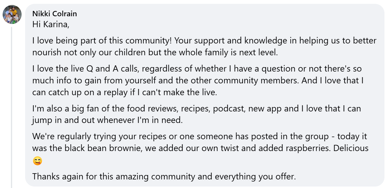 A: Yes! If you join now while we are running this offer, you will get lifetime access to Karina’s private group - Nourishing Kids